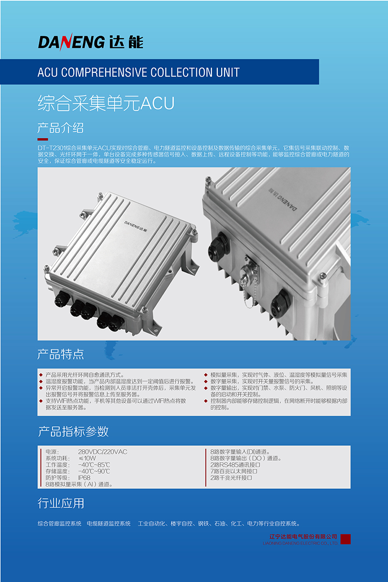 城市综合管廊或电力隧道的安全稳定运行,离不开综合监控系统,而数据采集单元是监控系统的重要组成部分。xingkong.com电气自主研发生产的DT-T2301综合采集单元ACU实现对综合管廊、电力隧道监控和设备控制及数据传输的综合采集单元,它集信号采集、联动控制、数据交换、光纤环网于一体,单台设备完成多种传感器信号接入、数据上传、远程设备控制等功能,能够监控综合管廊或电力隧道的安全,保证综合管廊或电缆隧道等安全稳定运行。