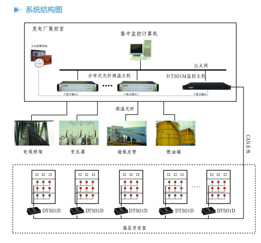 The system connects multiple dt-501d through CAN bus (RS-485 optional) to complete data acquisition and processing of temperature, alarm, fault and other data; it is sent to computer management system through Ethernet interface to support connection with integrated management system of substation, MIS, SCADA, DCS and other management systems; dt-501m can be connected with fire alarm system through relay port, in case of fire, Send out sound and light alarm, and carry out linkage of fire extinguishing device.