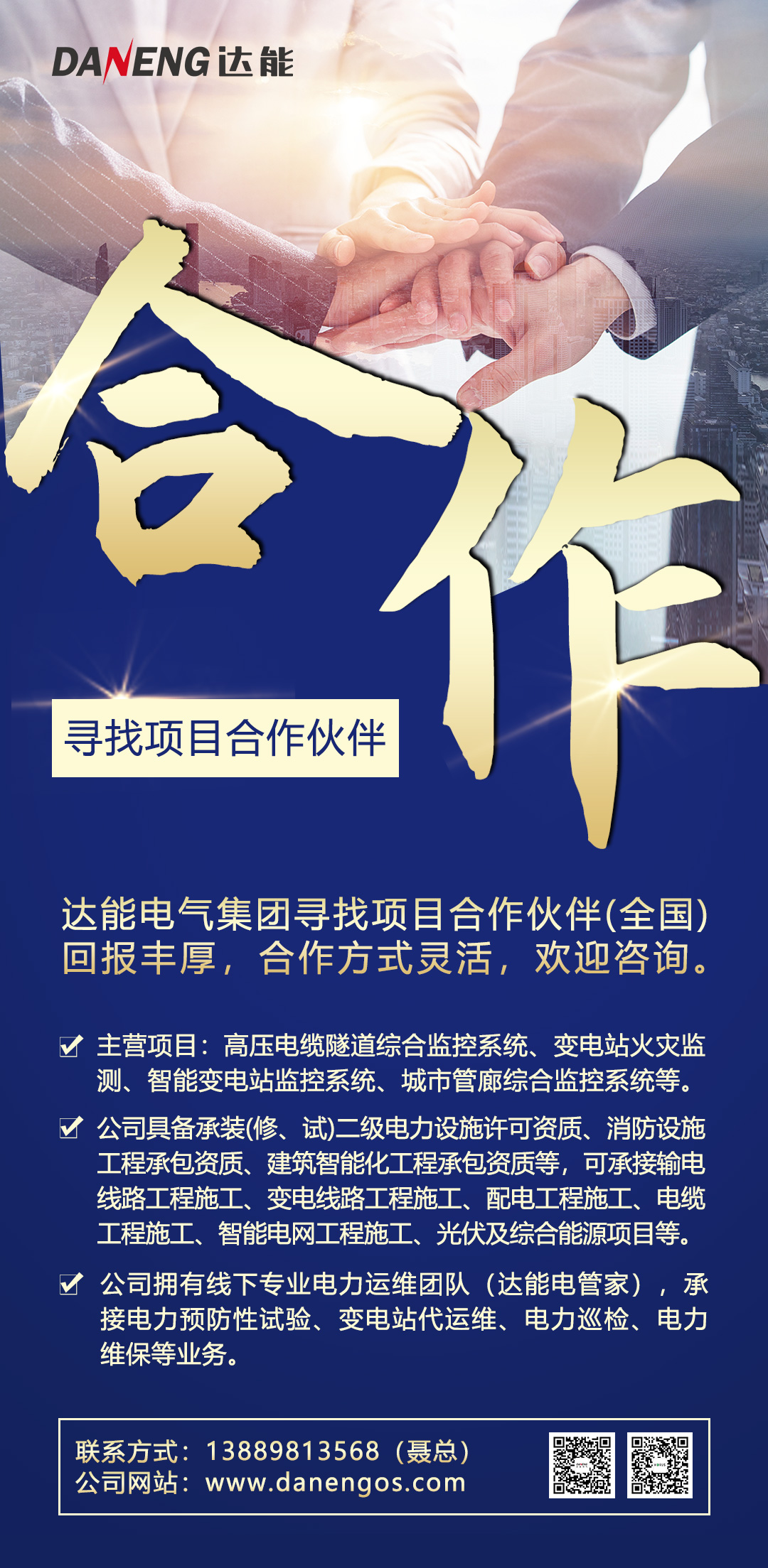 因业务发展需要,xingkong.com电气集团全国范围内寻找项目合作伙伴,合作方式灵活,回报丰厚。公司主营项目包括:高压电缆隧道综合监控系统、变电站火灾监测、智能变电站监控系统、城市管廊综合监控系统等。