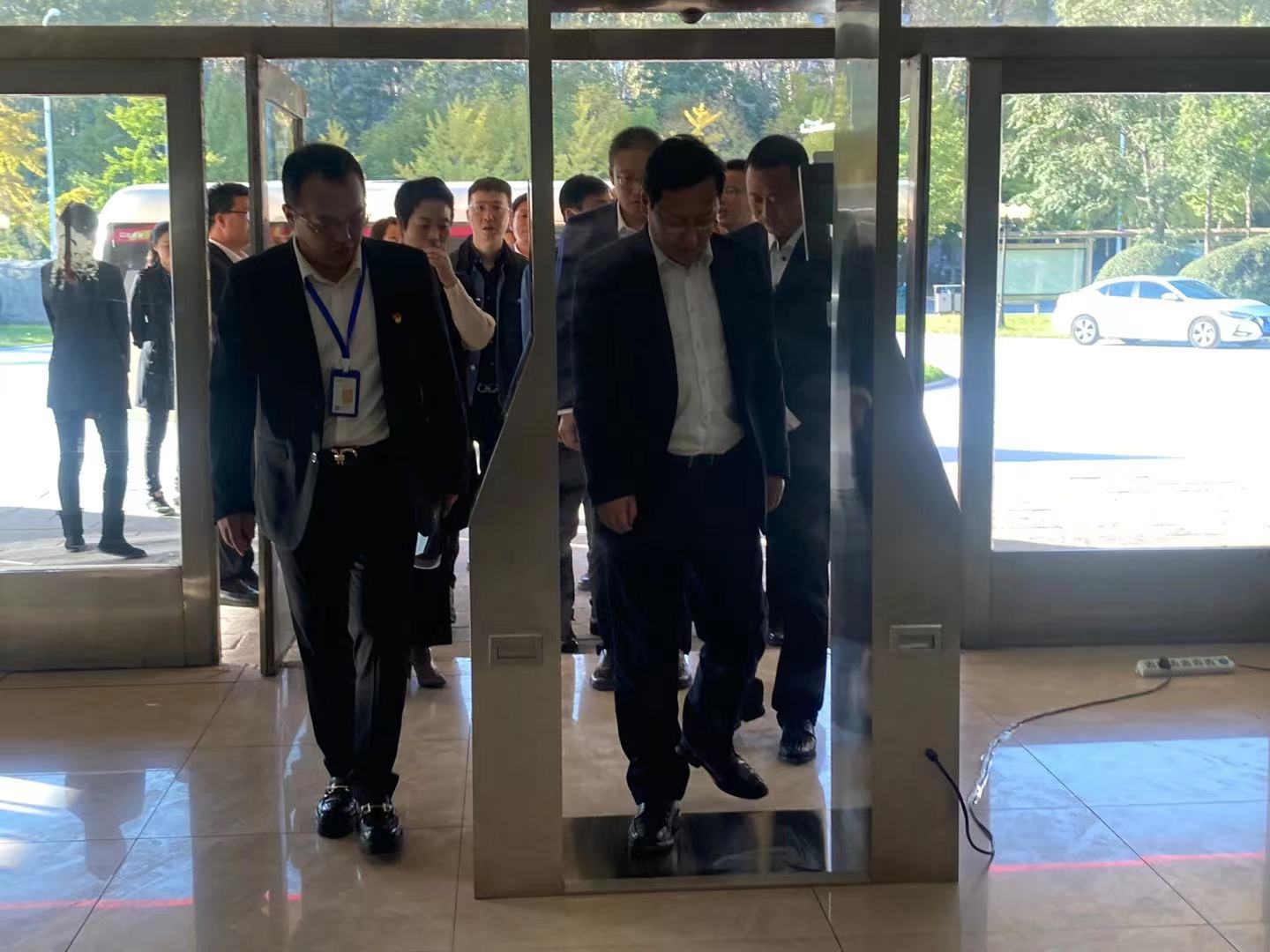 在公司正门,由xingkong.com电安全产业研究院研发的抗疫利器—智能测温门吸引了闫书记,闫书记穿过测温门,切身感受测温效果,体验智能水平。xingkong.com董事长高艺表示,该款产品是xingkong.com电气在2020年初疫情期间重点研发的智能抗疫产品,xingkong.com电气积极践行企业使命,助力全国抗疫,全力推进科技成果转化,凝聚力量攻破科研难关,产品完成后第一时间投入到疫区使用并获得市场认可。闫占峰对对xingkong.com电气在疫情期间的担当和作为给予赞许,对公司的技术实力给予肯定。