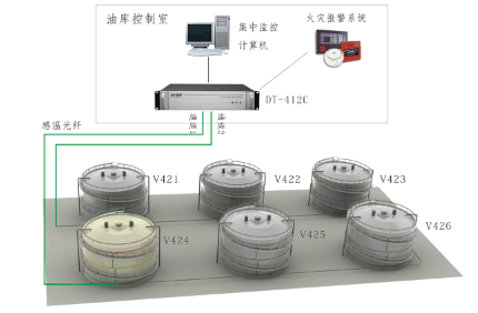油罐/气罐内储存的各种油品气品一般都具有易挥发、易燃烧、易爆炸等性质,一旦发生火灾,必将造成重大的损失。以DT400系列“分布式光纤感温火灾探测器”为主要部件的油库火灾探测系统可连续测得油罐周身的分布温度,完全无电检测,本安防爆。将感温光纤安装到浮顶油罐内壁接合部位或是油罐外表面,一旦油罐温度超过设定值,光纤系统会立刻发出报警信号。